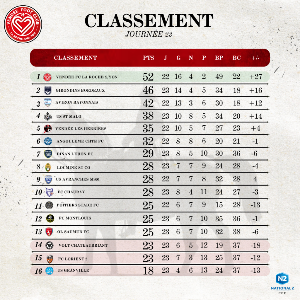 🔍 Retour sur le classement de notre équipe N2 après la 23ᵉ journée de championnat !